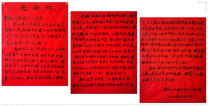 十三建公司結(jié)合每一名貧困戶的實(shí)際情況,按照就近安排的原則,把他們都安排在離家比較近的項(xiàng)目,既方便上班,又能照顧家里。為了讓貧困人員更好地適應(yīng)崗位需求,項(xiàng)目部對(duì)他們進(jìn)行了崗前培訓(xùn)和安全教育,普及文明施工知識(shí),開展相關(guān)技能培訓(xùn)。如今過去一個(gè)月了,所有貧困就業(yè)人員都及時(shí)拿到了第一個(gè)月工資,為了表達(dá)他們的心意,聯(lián)名給十三建公司寫了一封“感謝信”。