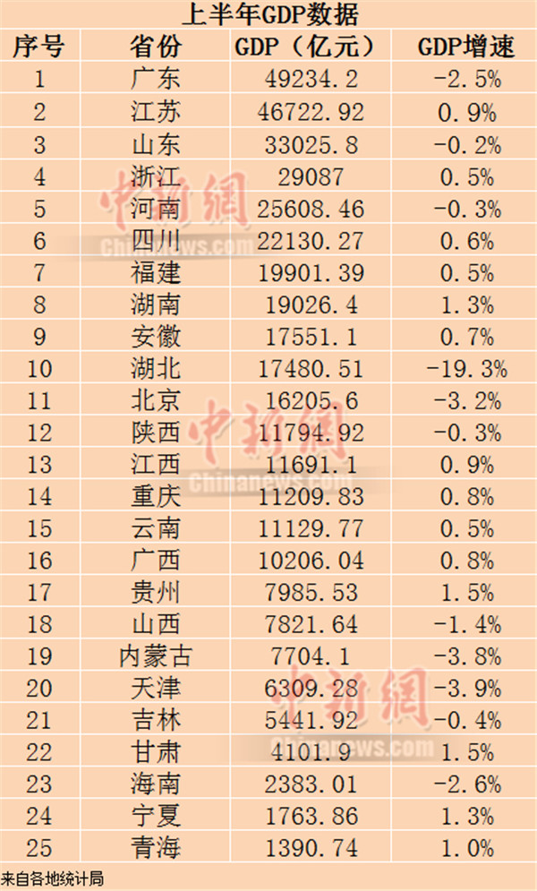 廣東上半年GDP為49234.20億元,同比下降2.5%;江蘇上半年GDP為46722.92億元,同比增長0.9%;山東上半年GDP為33025.8億元,同比下降0.2%。