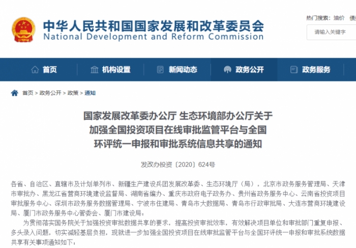 《通知》要求,加強全國投資項目在線審批監(jiān)管平臺與全國環(huán)評統(tǒng)一申報和審批系統(tǒng)數(shù)據(jù)共享。
