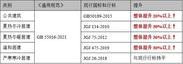 《通用規(guī)范》提高了居住建筑、公共建筑的熱工性能限值要求,與大部分地區(qū)現(xiàn)行節(jié)能標(biāo)準(zhǔn)不同,平均設(shè)計(jì)能耗水平在現(xiàn)行節(jié)能設(shè)計(jì)國(guó)家標(biāo)準(zhǔn)和行業(yè)標(biāo)準(zhǔn)的基礎(chǔ)上分別降低 30%和 20%。