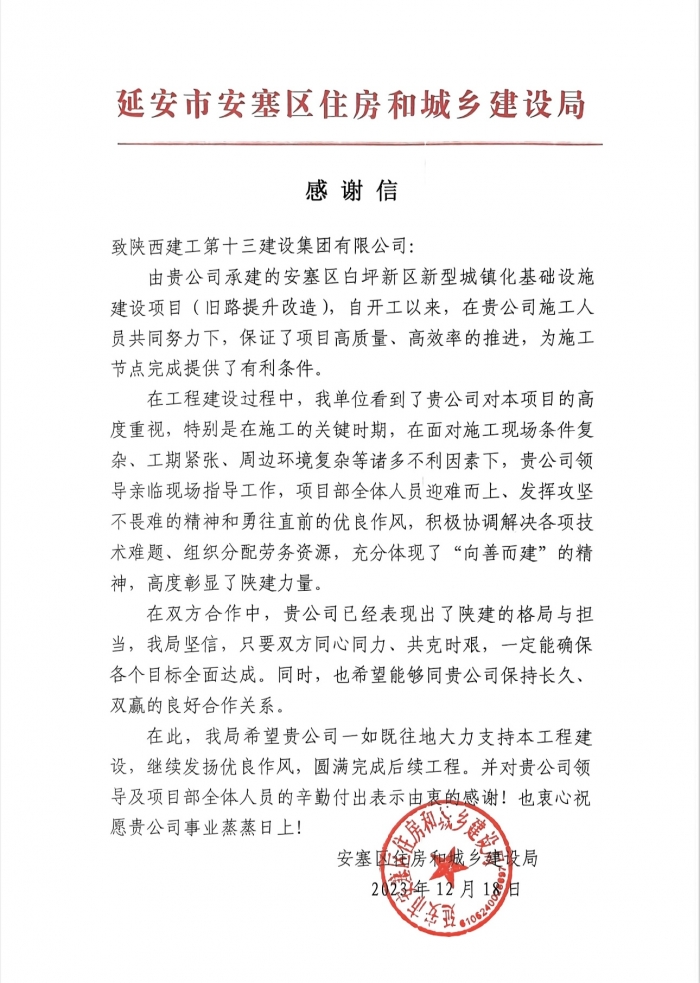 近日,集團(tuán)第一工程公司施工的安塞區(qū)白坪新區(qū)新型城鎮(zhèn)化基礎(chǔ)設(shè)施建設(shè)項(xiàng)目收到來(lái)自安塞區(qū)住建局的感謝信,對(duì)集團(tuán)項(xiàng)目部管理團(tuán)隊(duì)在施工過(guò)程中的迎難而上、攻堅(jiān)克難,高質(zhì)量、高效率推進(jìn)項(xiàng)目建設(shè)予以高度贊揚(yáng)。
